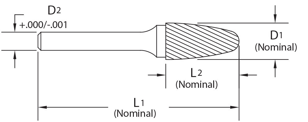 • Solid carbide 1/4" sizes and below, brazed construction over 1/4"