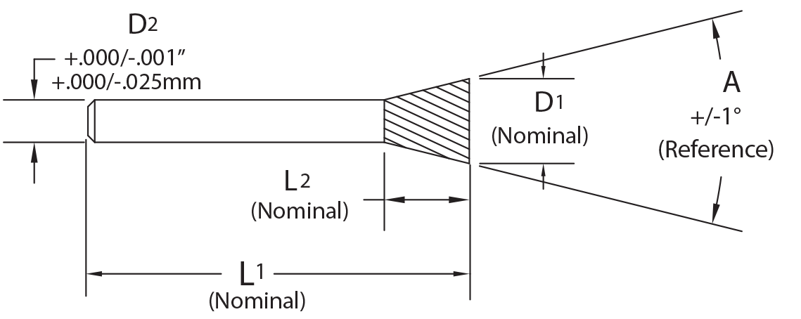 Tool No. EDP Diameter (D/D1) Shank Diameter (D2) Overall Length (L1) Flute Length (L2) Included Angle (A) Specification Type of Cut Coating Shank Type Available List Price