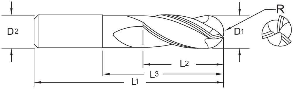 Solid Carbide TuffCut® X-AL 3 Flute Ball Nose End Mill, Neck Relief